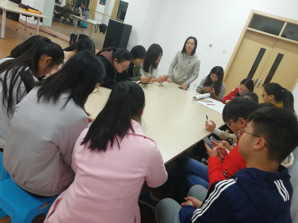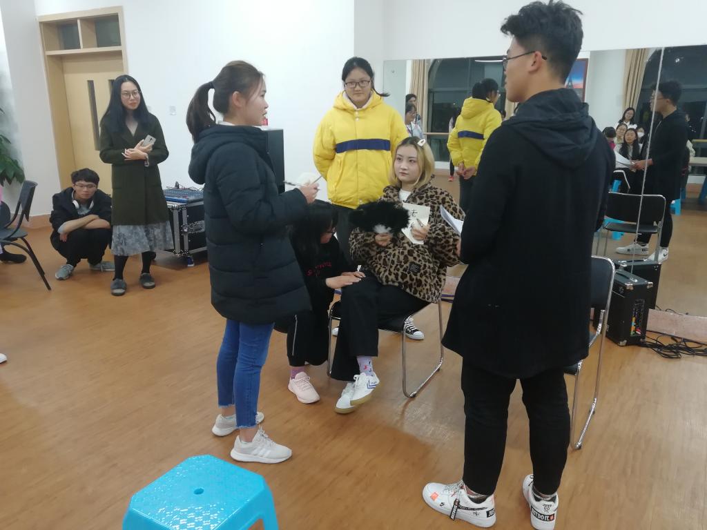 接下来就是重磅环节,杨老师要求每个组再根据自己组的主题,设计一个职场情景心理剧,要求有台词及岗位设置,准备时间为15分钟。同学们马上展开积极的讨论,首先设置情景,角色,事件及台词,确定后开始演练。最后,每个组依次进行表演,一个组围绕招聘人才是技能重要还是人脉重要的争论;一个组错把面试人员当老板的错误,考察应变能力;另一个组表现了职场新人怎么处理人际关系。表演非常精彩,可以看出同学们对心理剧主题有各自的思考。杨老师对每个组进行讲解点评,鼓励完成较好的部分,说明并分析了不足之处。