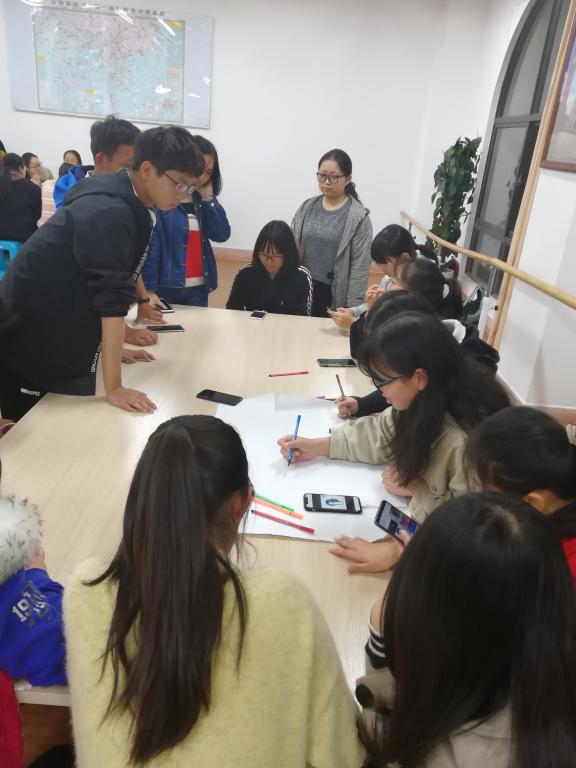 对于3个组,杨老师分配了不同的任务,首先让他们在2分钟之内讨论在职场中最重要的两个能力,各组各抒己见,有人际交往能力的,应变能力的,处理矛盾能力的,沟通能力的,个人能力的,大家各抒己见。针对大家的答案,杨老师给每个组选定了相对的主题,分别为人际交际能力,应变能力能力,专业技能,每个组分配一大张白纸,8支彩笔。由于第一组在活动开始时最先讨论出答案,可以享受最近的桌子椅子,另外两个组则要自己动手。第三组立马动手,第二组则要老师提醒才会行动。结果最后,第一组和第三组全部成员都有桌椅,但二组的部分同学只能站着。针对这个情况,杨老师适时提出在职场中资源是有限的,所以要自己积极主动争取做资源的拥有者与占有者。每个组在20分钟内,设计队名、口号,每人书写一句与主题相关的短句或词组等。计时开始,有的组开始分工,明确各自的任务,有的组开始查资料。在这个过程中,杨老师与两位观察员对各个组进行观察。时间结束后,每个组依次上台展示成果,每个组有各自的特色。从海报排版,内容的匹配度,讲解情况等考虑,杨老师选出了最优秀的一个组,并给他们送出数据线,湿纸巾等礼物。针对同学们的提问,杨老师积极解答,并提出了一系列建议。