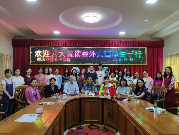 第二天,何淼淼副书记一行率领同学们到访曼德勒福庆学校孔子课堂。福庆学校校长李祖清教授、孔子课堂中方主任李涛副教授对我们的到来表示热烈欢迎。在座谈会上,李涛老师激励在缅留学的同学们要努力学习,尽快适应缅甸生活,学以致用,并鼓励大家到教学点做志愿者,增加自己的社会实践经验。随后,何淼淼副书记也介绍了必赢官网留学生情况,对在缅学习的同学们提出了新的要求和期望,并希望进一步加强必赢官网与与福庆孔子课堂的合作。最后,福庆学校校长李祖清教授表示,今后将为在缅学习的云大留学生们专门开设缅甸文化讲座课程,提供更加优质的志愿服务岗位和学习资源。