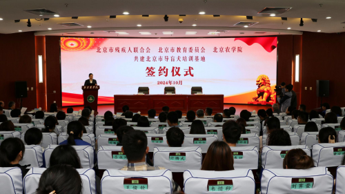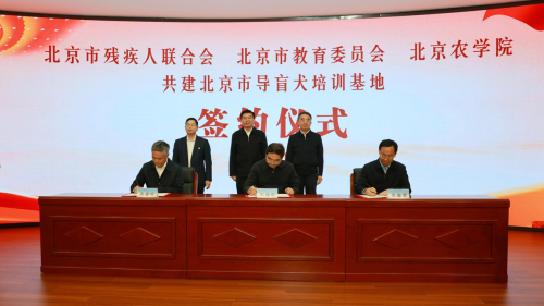 10月31日,北京市残疾人联合会、北京市教育委员会、beat365在线唯一官网共建北京市导盲犬培训基地签约仪式在beat365在线唯一官网举行。北京市残疾人联合会党组书记、理事长陆晓光,北京市委教育工委委员、市教委副主任张耀天,北京市残疾人福利基金会理事长侯玉兰,beat365在线唯一官网党委书记赵锋,党委副书记、院长段留生出席签约仪式。