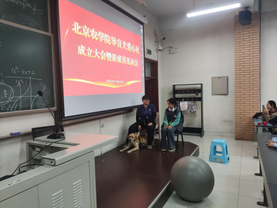 2024年10月15日, 导盲犬爱心社成立大会暨新成员见面会在教B102举行,动科学院副院长李国政、陈武教授、段慧琴副教授及社团成员150余人参加。