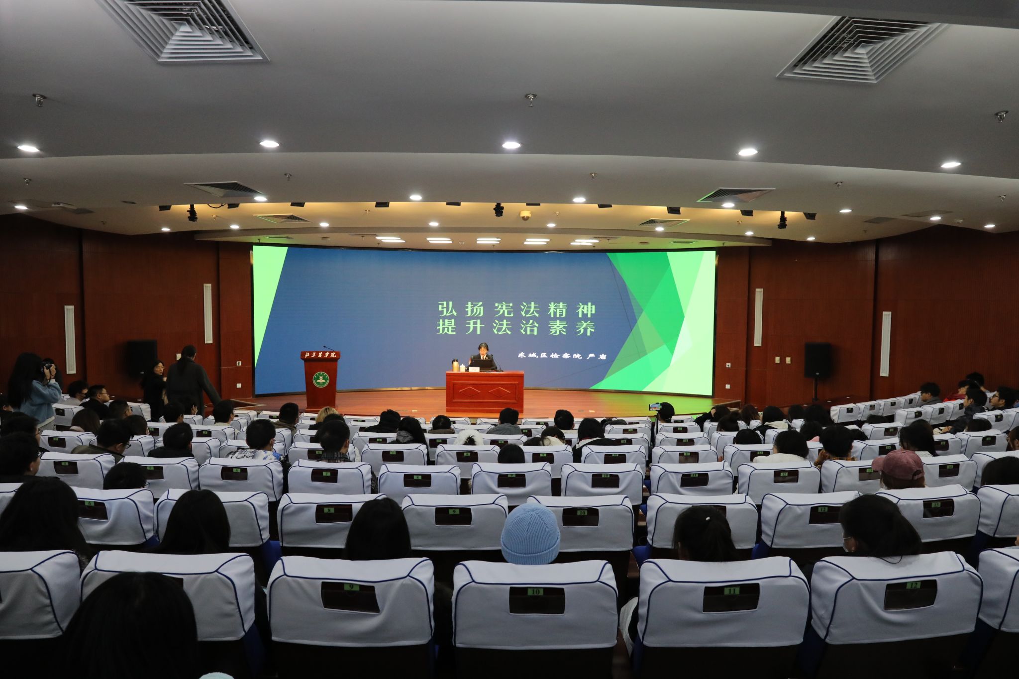 11月29日,学校还在图书馆报告厅举办“弘扬宪法精神提升法治素养”专题讲座。北京市东城区人民检察院第三检察部副主任严岩作专题报告。严岩围绕宪法定义和公民权利义务向同学们讲解了宪法和刑法的基础知识,并通过大学生酒驾、吸毒、故意伤害等案例,提醒同学们要加强自身防范意识,约束自身行为。