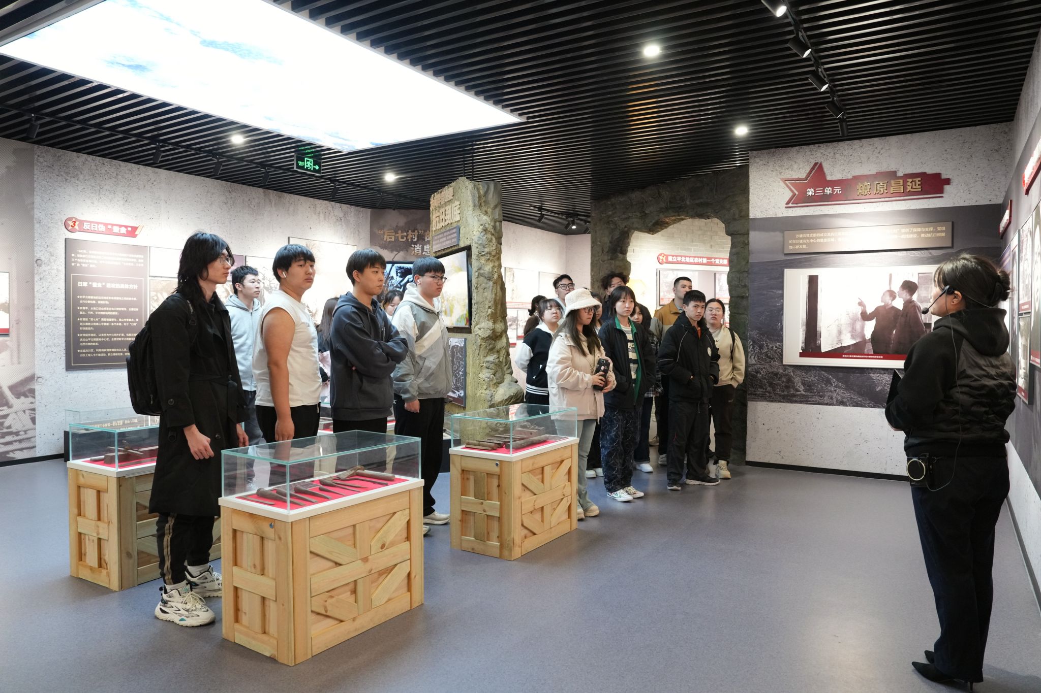 在大庄科乡沙塘沟村,师生共同观看了爱国主义影片《平北红色第一村》,参观了平北红色第一村纪念馆,深刻体会革命战争年代,在中国共产党坚强领导下,沙塘沟及周边群众与敌周旋、不畏牺牲、粉碎扫荡、反击“蚕食”、英勇锄奸的事迹,聆听老党员讲述“红色故事”。通过一块块展板、一件件实物、一幕幕鲜活的战斗场景、一处处真实质朴的展品,同学们进一步认识到中国特色社会主义道路的来之不易。思政课教师王建利、熊学艺围绕弘扬革命文化、传承红色基因开展了现场教学,教育引导学生坚定理想信念,坚定不移听党话、跟党走。