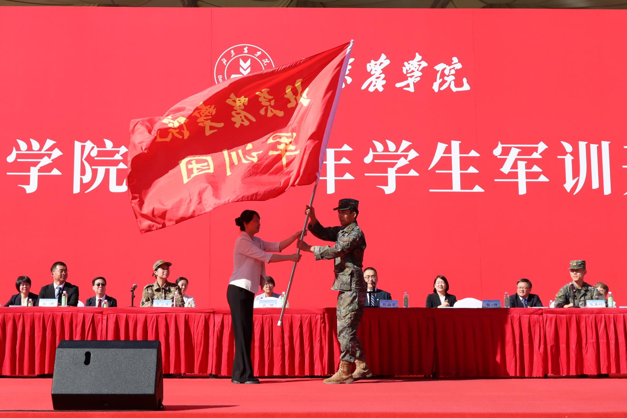 武艳向军训团授团旗。