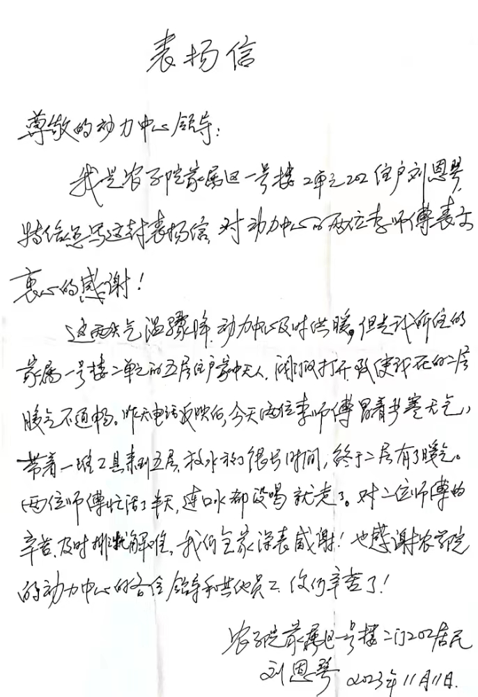 近日气温骤降,后勤基建处动力保障服务中心按照上级要求及时供暖全力维护好师生的生活环境。11月11日,动力中心收到了农学院家属区居民的表扬信,信中感谢李建龙、李学立两位员工——他们“冒着严寒,及时上门,服务周到,立即解决问题”的服务态度令人感动。