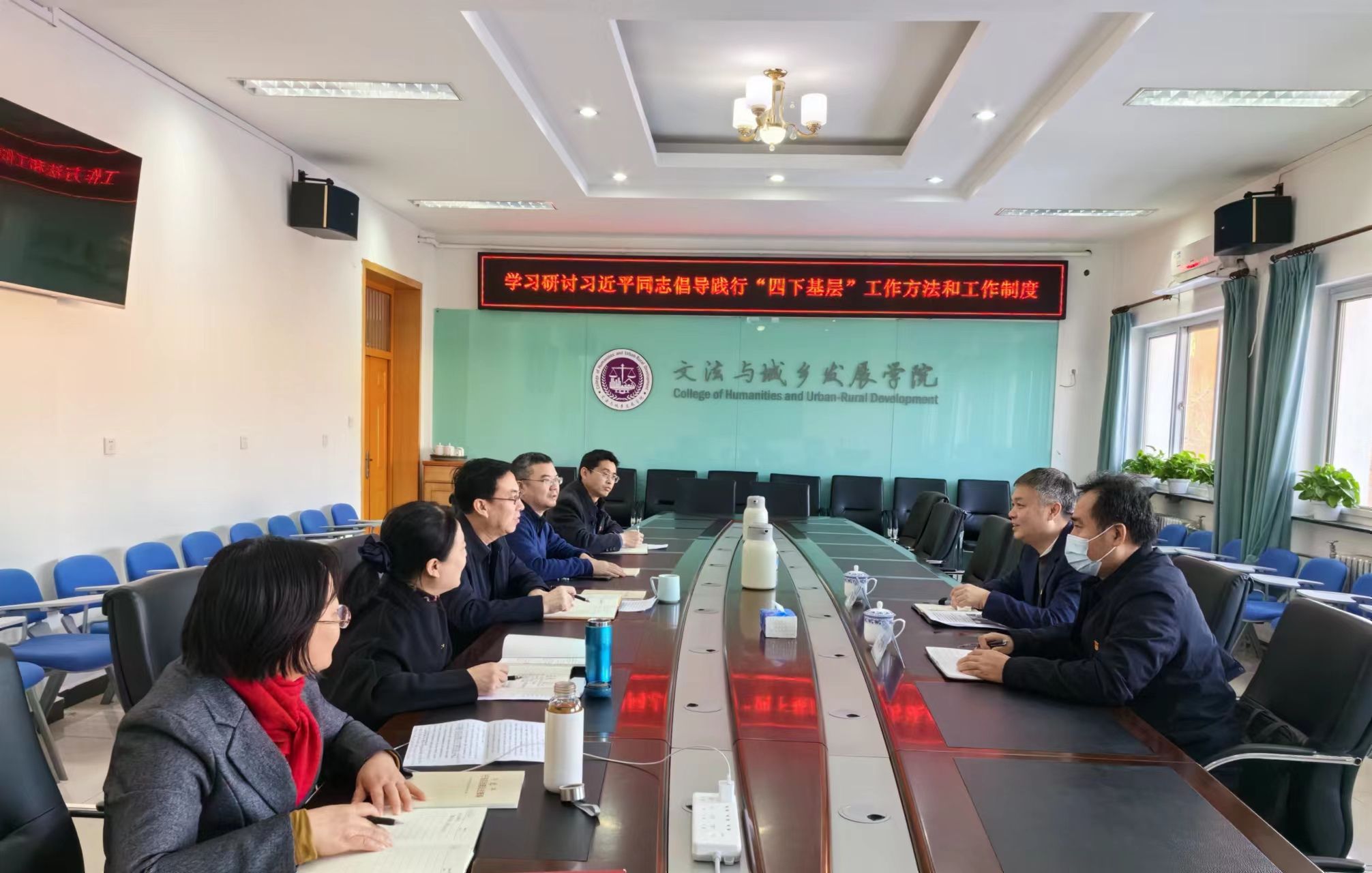 2023年12月22日上午,文法与城乡发展学院党委在文发楼322室召开理论学习中心组会议,学习研讨习近平同志倡导践行“四下基层”工作方法和工作制度。全体党委理论学习中心组成员进行交流发言,围绕学习贯彻“四下基层”工作方法和工作制度、落实新时代“枫桥经验”,结合学习《习近平基层治理论述摘编》谈体会、谈收获。学校党委常委、副校长张劲柏,国有资产管理处处长宋文东到会指导,会议由学院党委书记赵和文主持。