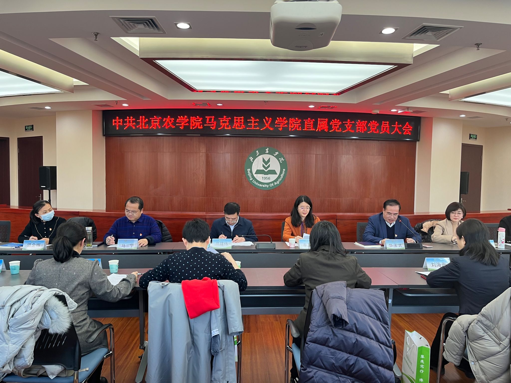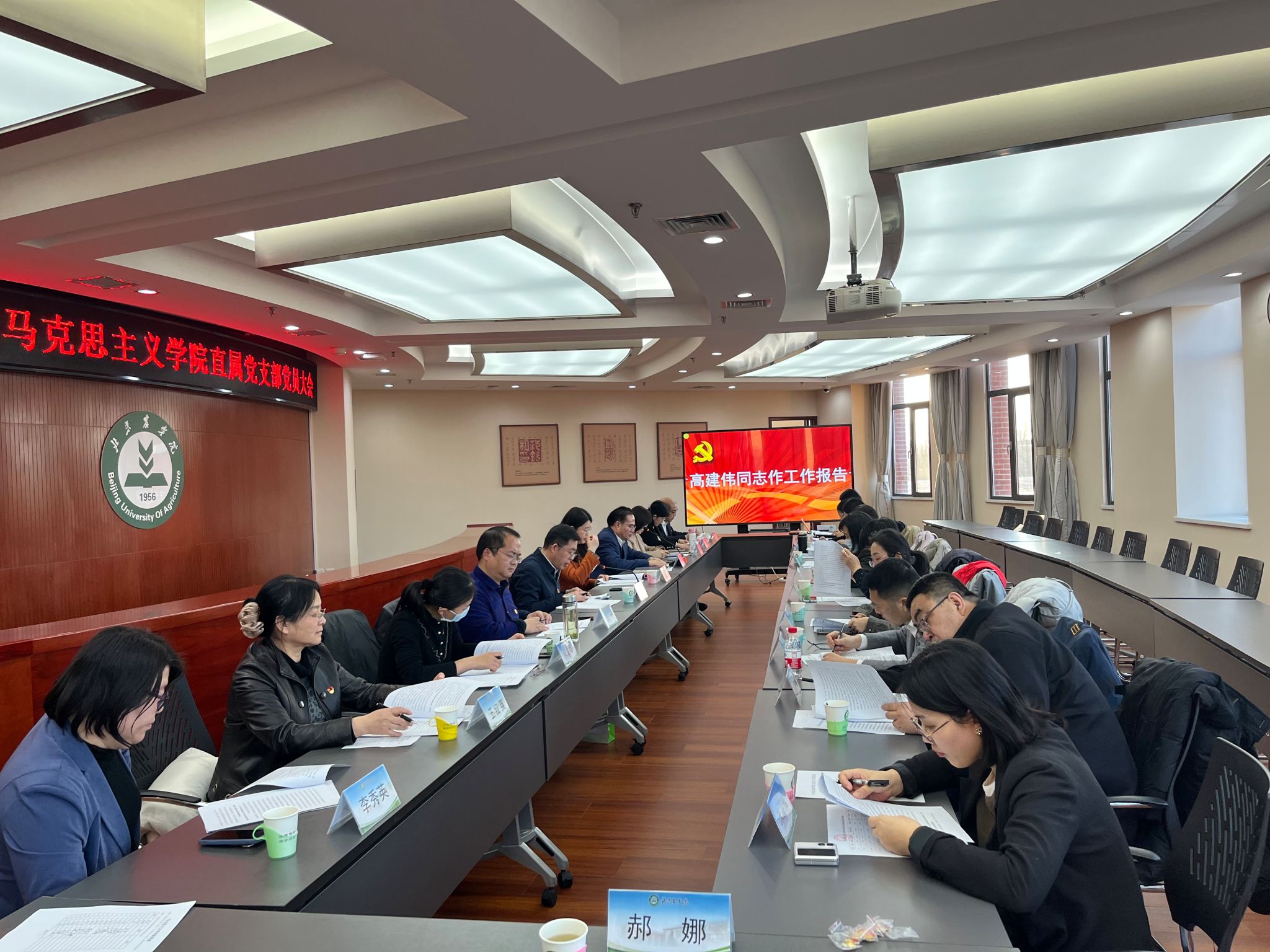 高建伟同志代表上一届支部委员会作题为《凝心聚力 砥砺奋进努力开创马克思主义学院高质量发展新局面》的工作报告。他指出,在学校党委的坚强领导下,马克思主义学院直属党支部深入学习贯彻党的二十大精神和习近平总书记关于思政课改革创新的重要讲话和指示批示精神,认真贯彻学校第四次党代会精神,全力办好立德树人关键课程,凝心聚力推动学院事业高质量发展。学院深入学习宣传贯彻党的二十大精神;积极探索农业院校思政课改革创新路径,努力打造“红绿融合式”思政金课;切实加强队伍建设,着力打造政治强情怀深思维新视野广自律严人格正的思政课教师队伍;加强领导班子自身建设和基层党组织建设,不断推动全面从严治党主体责任落细落实。今后五年,要对照学校第四次党代会确定的“1956”目标举措,把思政课打造为“首善标准、红色基因、北农特色”的课程,把马克思主义学院建设成为马克思主义理论教学、科研、思想宣传和人才培养的坚强阵地。