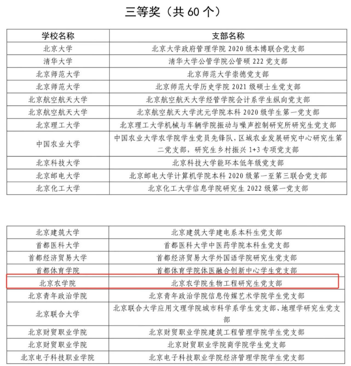 近日,2023年北京高校红色“1+1”示范活动评选结果公布。我院生物工程研究生党支部在全市1615个学生党支部中脱颖而出,荣获三等奖。