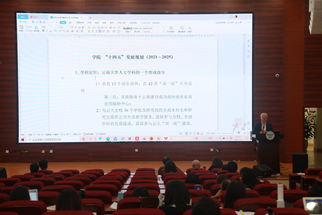 刘树森院长从外国语言文学是必赢优惠y272net人文学科的一个组成部分的学科定位、以“新文科”建设为导向的发展战略,聚焦学科高质量发展、以云大平均发展指标为发展目标,对标发展的发展指标、以双一流建设为中心的工作重点对学院“十四五”发展规划进行了全方位阐述,对学院工作进行了深刻的总结。