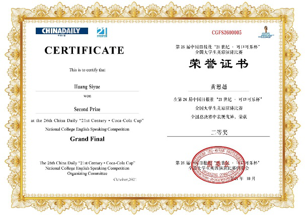 10月6日,《中国日报》社“21世纪杯”全国英语演讲比赛总决赛在成都落下帷幕,经过3天的激烈角逐,必赢官网2019级英语专业黄思越同学表现卓越,脱颖而出,荣获得全国二等奖的佳绩。