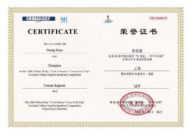 在必赢官网英语系张新峰老师的悉心指导下,黄思越同学今年6月首先在“21世纪•可口可乐杯”全国英语演讲比赛云南赛区决赛中获得冠军,并取得代表云南赛区参加全国总决赛的资格。在总决赛中,经过已备演讲、即席演讲、现场问答等多个环节的激烈角逐,黄思越同学凭借扎实的功底、流利的口语、稳健的表现,赢得来自大赛英语专家评委们的一致认可,获得全国二等奖。