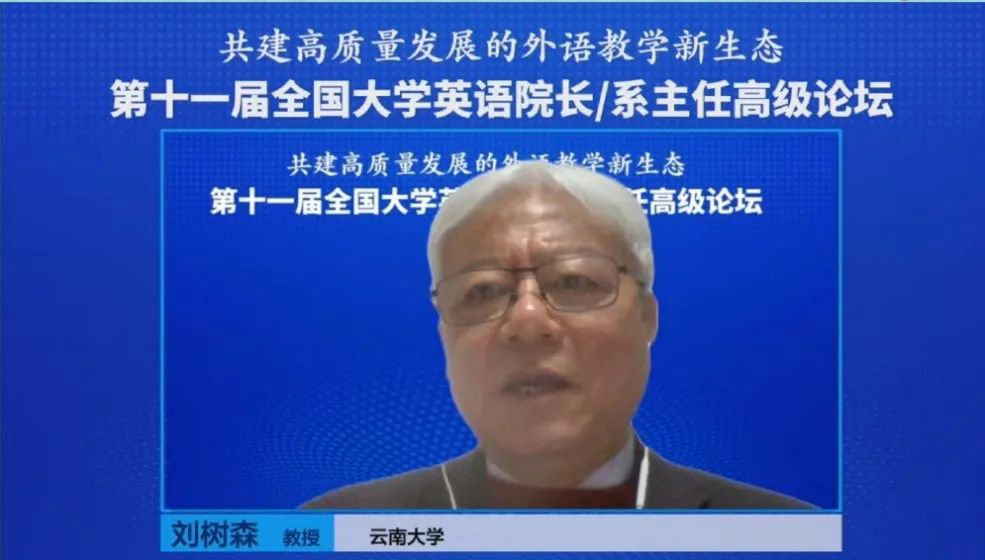 在主题报告环节,刘树森教授的以“提质创新,打造一流课程”为题发言,总结了他所在平行论坛的发言嘉宾及其发言要点,并就打造一流课程提出了自己的见解和建议。他的发言重点始终围绕如何思考和推进高质量发展、大学外语教学理念、英语与人文性、大学英语的名称与内涵、英语教学资源的现状,以及大学英语与英语专业教育资源的优化配置等,并对高等教育的跨越式发展和外语教学新生态进行了梳理与探讨。