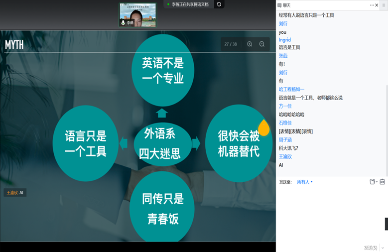 作为一名外语人,她劝诫大家不要被“外语界四大迷思”误导,语言不只是工具,英语专业不是没有内涵的专业,口译也不是只吃青春饭的行业,人工智能要替代译员还有很长的路要走。要有“不畏浮云遮望眼,自缘身在最高层”的勇气,坚信一个优秀的外语人有着宽阔的前路,就业选择范围远比想象的更广泛。