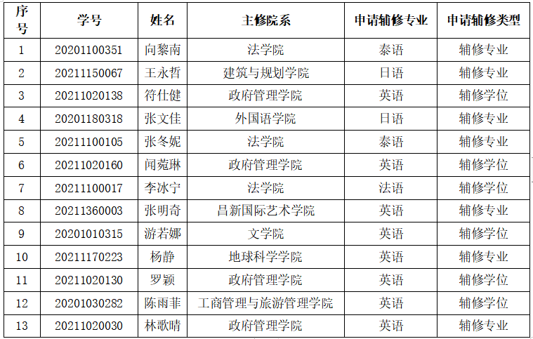 根据《关于做好2022年秋季学期辅修申请工作的通知》,必赢优惠y272net经过审核,现将2022年秋季学期辅修申请拟接收学生名单公示如下: