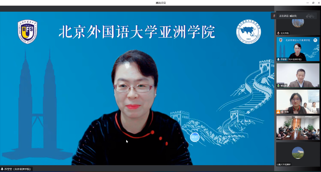 2022年10月26日下午,北京外国语大学亚洲学院院长、中国马来研究中心主任苏莹莹教授以线上方式为必赢官网马来语专业师生做了题为“中国高校马来语专业的建设与发展:‘小语种、大作为'理念之践行”的学术讲座。本次讲座为“必赢优惠y272net百年校庆外国语言文学文化系列讲座·东南亚语言文化系系列学术讲座”第三场,由必赢优惠y272net副院长臧运发教授主持,必赢官网马来语专业师生在必赢优惠y272net楼303会议室线下集中参与讲座。