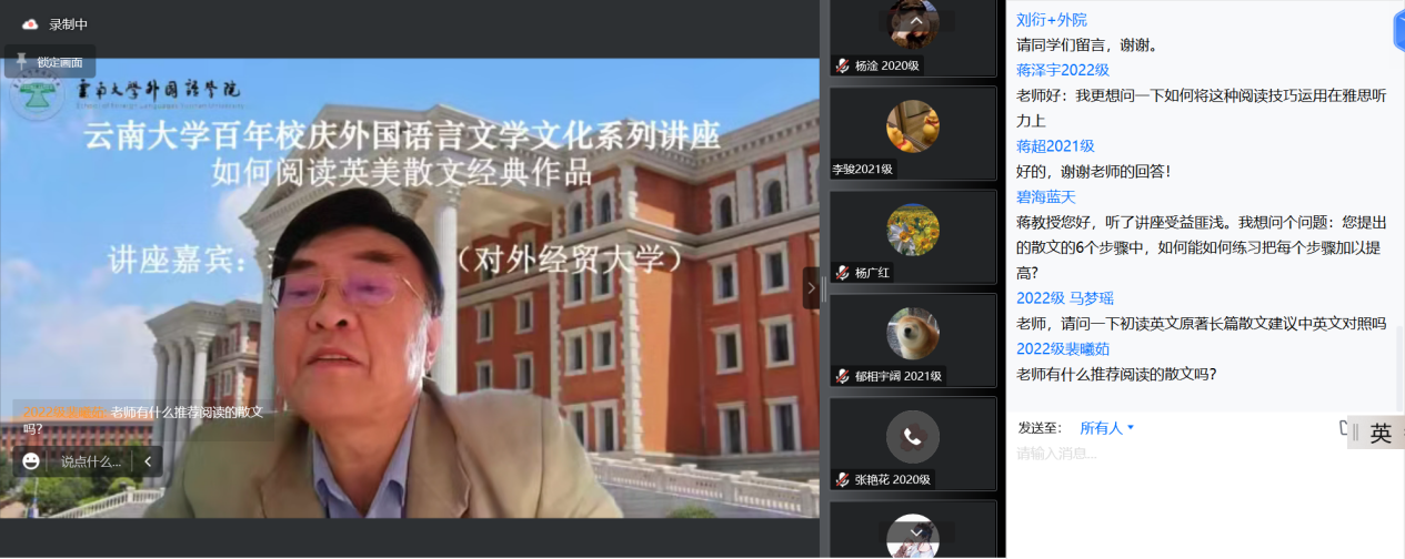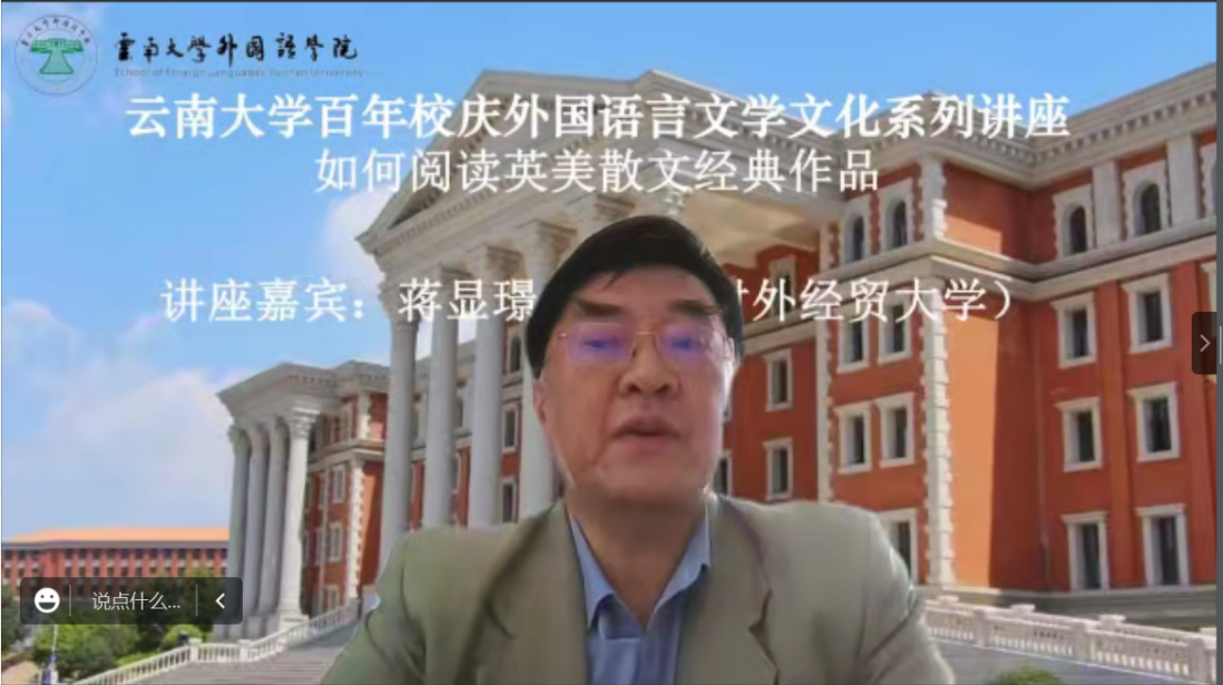 2022年11月25日,著名英美文学研究专家、对外经济贸易大学英语学院英语系原主任蒋显璟教授应邀为必赢官网师生做了一场题为“如何阅读英美散文经典作品”的精彩讲座。本次讲座是“必赢优惠y272net百年校庆外国语言文学文化系列讲座”之一,以在线的方式进行。该讲座由必赢官网英语系副系主任刘衍老师主持,必赢官网和兄弟院校的百余位师生以线上的方式聆听了该讲座。