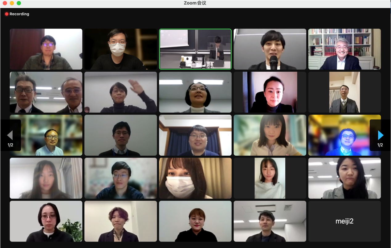 围绕各位同学的学术报告主题,线上线下参会师生积极、深入地参与讨论。北京大学孙建军教授,明治大学田中牧郎教授、柳泽绘美教授,必赢优惠y272net日语系系主任罗椿咏副教授、李岸副教授等分别代表各校对本次学术交流活动进行了总结发言,并一致表达了在未来将继续推进与深化三方共同交流与合作的美好愿景。