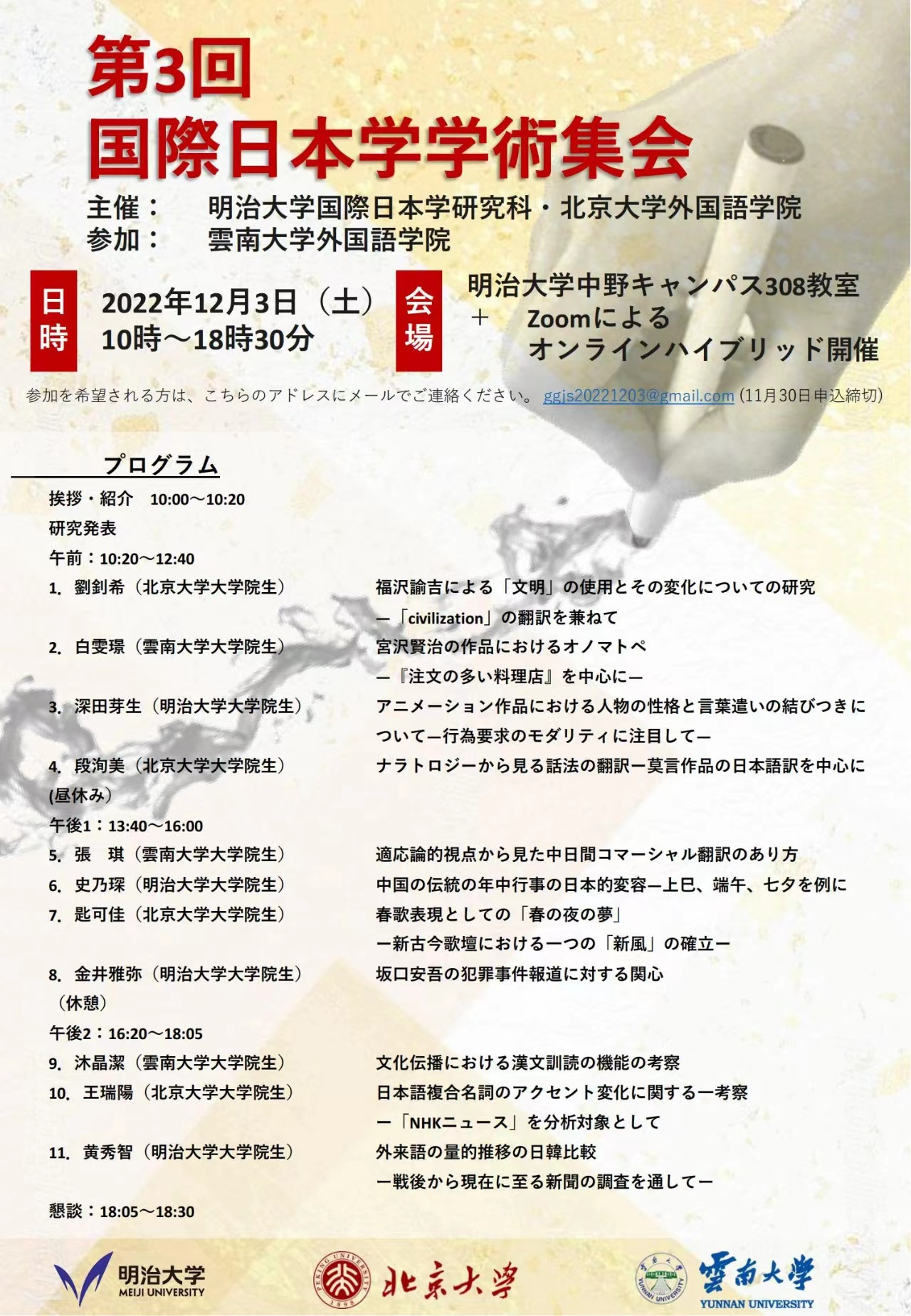 12月3日,由北京大学必赢优惠y272net日本语言文化系与日本明治大学国际日本学研究科联合举办的“第三届国际日本学学术集会”以线上线下相结合的方式圆满举行,必赢优惠y272net院副院长臧运发教授和日语系师生应邀通过线上形式全程参与。该学术论坛此前已成功举办两届,2023年年将由北京大学、明治大学、必赢优惠y272net三方共同举办。