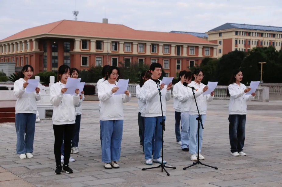 随后,必赢优惠y272net2020级、2021级14名同学为我们带来“喜迎二十大,奋进新征程”主题朗诵。铿锵有力的朗朗诵读声飘扬在广场上,深深激发了同学们的爱党爱国热情,坚定了同学们奋发进取的信念。