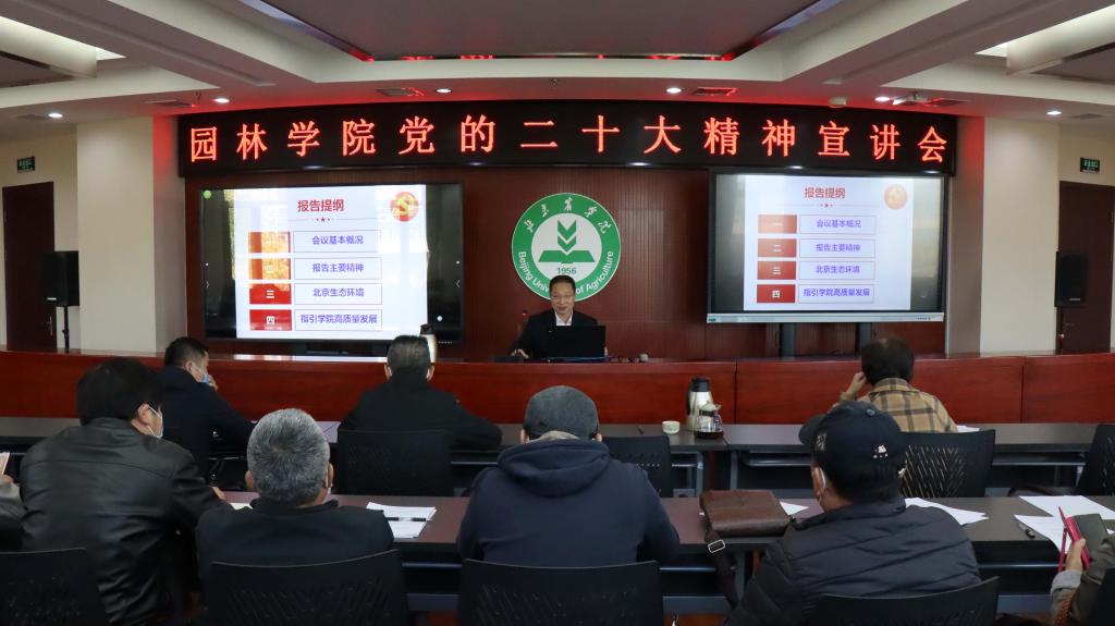 张德强强调,园林学院要把学习宣传贯彻党的二十大精神作为当前和今后一个时期的首要政治任务,坚守为党育人初心,强化为国育才担当。学院党总支要切实抓好党的二十大精神的学习培训、宣传宣讲、理论研究和贯彻落实,将党的二十大精神充分体现到学院办学、管理、服务各方面,落实到教师教育教学、学术研究各环节,融入到学生求知求学、成长成才各领域。将“六个坚持”践行到每一堂课、每一个研究项目、每一名学生毕业设计之中,切实深入推动习近平新时代中国特色社会主义思想和党的二十大精神入脑入心。张德强还结合首都生态环境建设新需求和学校学科专业建设新布局,着眼园林学院实际和发展前景,阐明了未来建功“推动绿色发展,促进人与自然和谐共生”事业的发展道路。要求学院要力争做强优势学科,提升教学、科研、社会服务水平,培养更多高素质园林人才。希望全体师生努力践行“厚德笃行、博学尚农”的校训精神,以自强不息的奋斗精神,只争朝夕,仰望星空,脚踏实地,进一步谋划好明年乃至今后几年的发展目标和路径,凝心聚力为乡村振兴做出贡献,推动学院高质量发展。