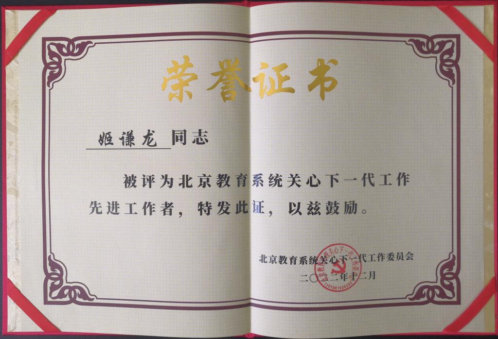 beat365研究生教学督导组获评“北京教育系统关心下一代工作先进集体”,退休教师陈学珍和姬谦龙获评“北京教育系统关心下一代工作先进工作者”。