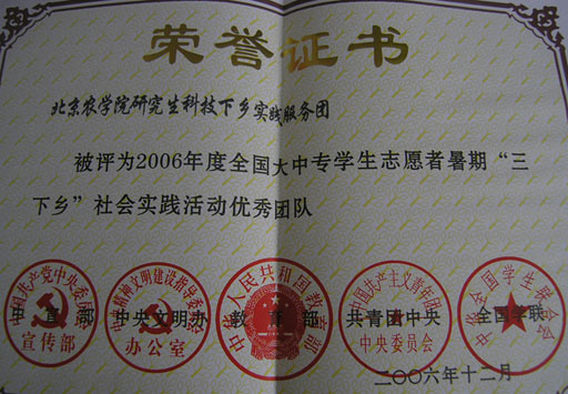 研究生科技下乡实践服务团自2005年组建以来,多次组织研究生利用暑假及课余时间,发挥学科专业优势,结合京郊新农村建设需要开展科技下乡实践服务活动,为京郊农村经济发展做出了积极贡献。该社会实践团已连续2年被评为首都高校暑期社会实践优秀团队。