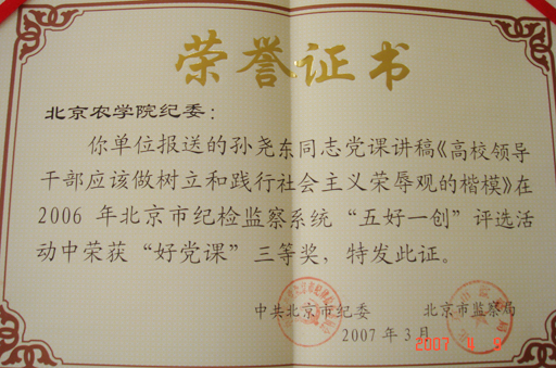 2007年3月28日,中共北京市纪委召开了“2007年北京市纪检监察系统宣传教育工作会议”,会上表彰了 “2006年北京市纪检监察系统‘五好一创’(好党课、好作品、好新闻、好电教片、好网站、工作创新)”评选活动中的获奖单位和个人,beat365纪委报送的孙尧东同志《高校领导干部应该做树立和践行社会主义荣辱观的楷模》的党课讲稿荣获“好党课”三等奖,是20个“好党课”一、二、三等奖获奖单位中唯一的高校获奖者。