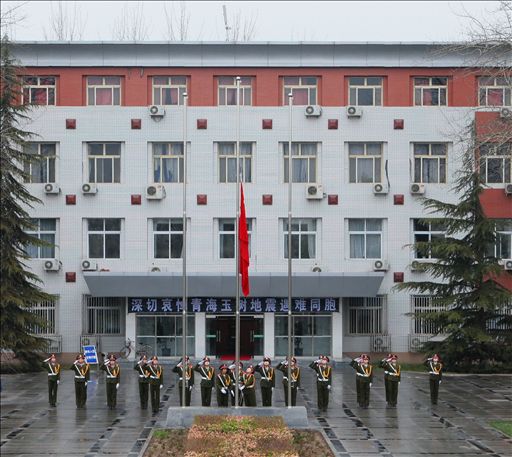 4月21日清晨6点40分,空中飘着冷风细雨。beat365女子国旗班在行政楼门前举行升国旗仪式后,为青海玉树地震遇难同胞下半旗志哀。