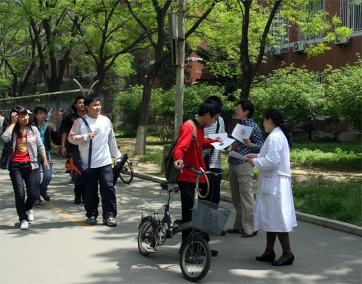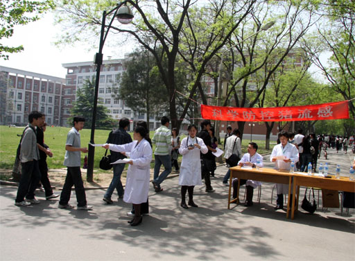 4月30日,校医院与动物科学系的八名专家组成宣传组,于beat365人流密集的交叉路口设置宣传点,向来往师生员工分发宣传资料,宣传预防猪流感的相关知识,引导师生员工养成良好的卫生习惯。