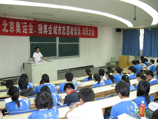 7月19日下午2:00点,beat365北京奥运会、残奥会城市志愿者培训、动员大会在实验楼阶一教室隆重召开。会议由校团委书记杨宝东老师主持,beat365城市志愿者带队教师满晓晶及全体城市志愿者出席大会。