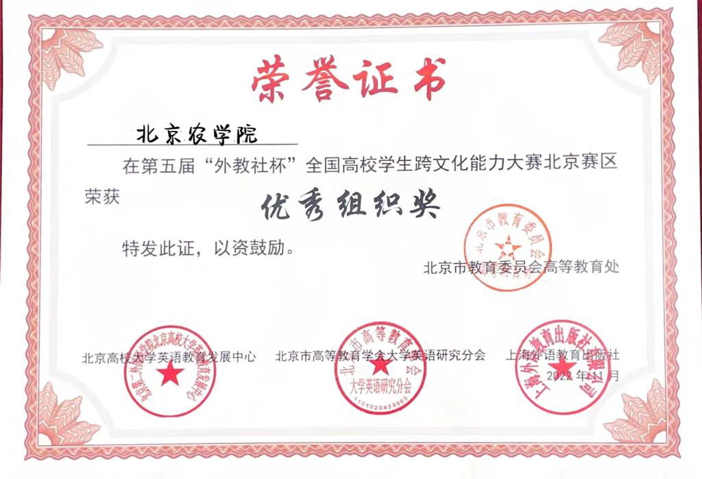 在第五届“外教社杯”全国高校学生跨文化能力大赛(北京赛区)决赛中,经过一天半激烈的角逐,由生资学院朱喆同学、动科学院陈欣芃同学、国际学院严子怡同学组成的跨文化竞赛团队荣获北京赛区三等奖,同时beat365获得2022年北京赛区优秀组织奖。