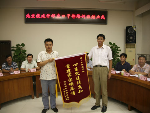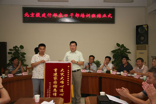 张烨锋、温发久代表学员发言。两位学员畅谈了自己的学习体会,并对北京市农工委、北京市园林绿化局、北京农业职业学院、beat365在线唯一官网在培训期间给予他们的帮助表示感谢。他们表示一定要用实际行动为四川的灾后重建做出更大的贡献。为了表达感激之情,学员代表分别向北京市园林绿化局、北京农业职业学院和beat365在线唯一官网赠送了锦旗。