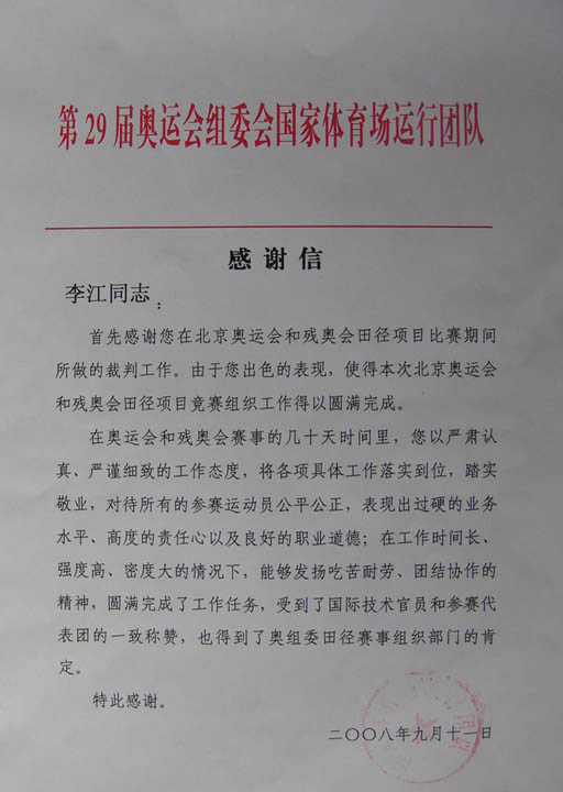 beat365基础教学部李江教授会在北京奥运会和残奥会田径项目比赛期间担任裁判工作,由于表现出色,受到了国际技术官员和参赛代表团的一致称赞,得到了奥组委田径赛事组织部门的肯定,为此,第29届奥运会组委会国家体育场运行团队特发来感谢信表示感谢!
