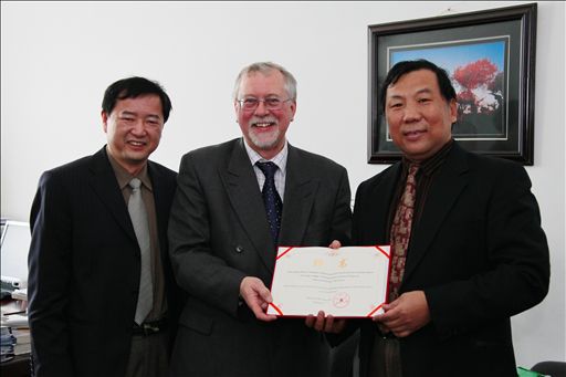 副校长杜晓林亲切会见Brian Revell教授并就目前合作办学项目的相关事务及两校今后的合作与交流活动交换了意见,并代表王有年校长向Brian Revell教授颁发了beat365在线唯一官网客座教授聘书,国际学院院长谭锋和计财处处长杨力参加了会谈。