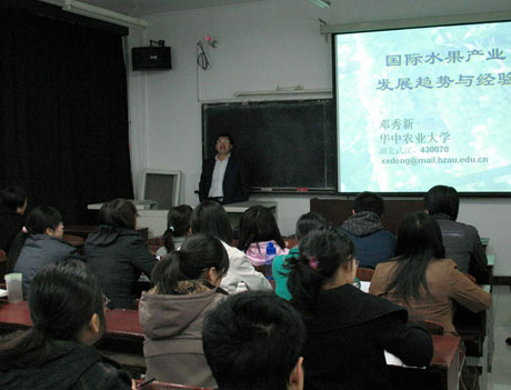 3月24日晚7点,华中农业大学校长邓秀新院士来beat365进行学术交流。在教A-220,邓秀新院士以“国际水果产业发展趋势与经验”为题作了学术报告。报告会由校长王有年教授主持。副校长姚允聪教授、植物科技学院院长秦岭教授、生物技术系主任师光禄教授、园艺学科骨干教师及研究生60余人聆听了报告。