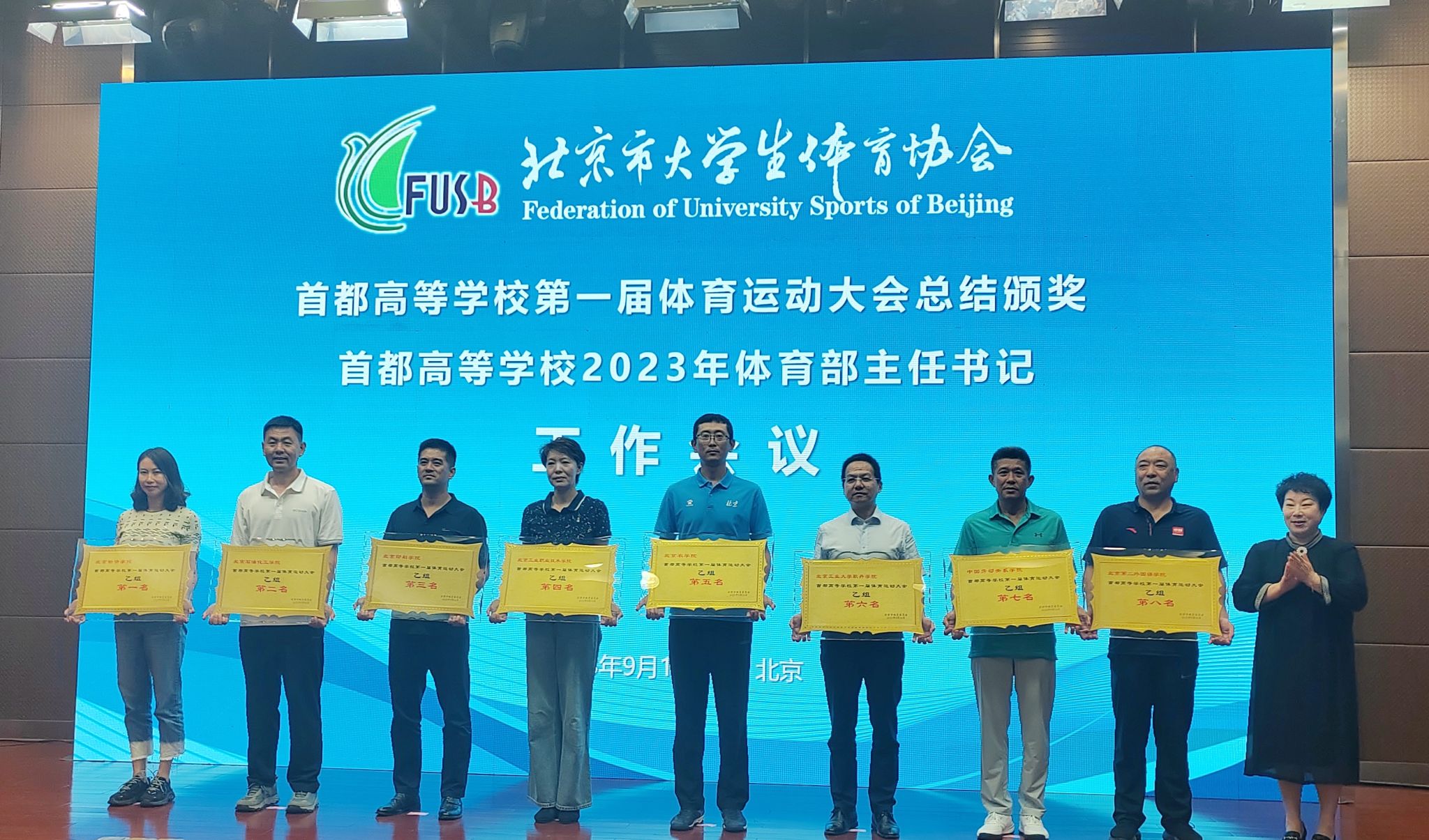 9月16日至17日,由北京市教育委员会主办、北京市大学生体育协会承办的首都高等学校第一届体育运动大会(以下简称“高运会”)总结和颁奖大会暨首都高等学校2023年体育部主任书记工作会议召开。beat365在乙组32所学校中取得团体总分第五名的优异成绩,其中龙舟比赛、教师课程思政演讲比赛、教师基本功比赛获得单项总分第一名。学校还获评“校长奖”和“主任奖”。