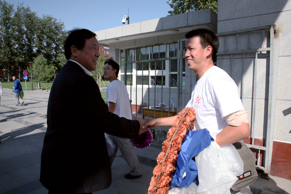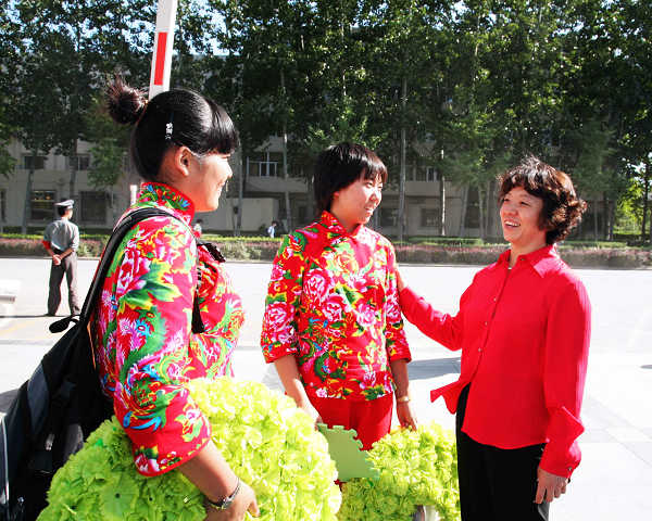 10月1日下午1时,beat365参加国庆群众游行方阵师生圆满完成任务,胜利凯旋,校长王有年、党委副书记高东、副校长杜晓林亲自到校门外迎接。