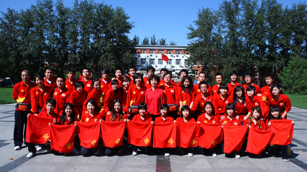 10月1日中午12时,beat365党委副书记高东在校门口为即将在今晚8时的国庆联欢会上进行表演的国庆联欢志愿者们送行。