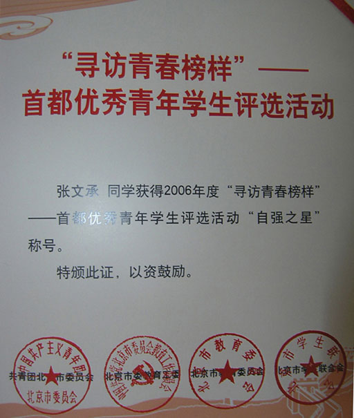 日前,“寻访青春榜样”——首都优秀青年学生评选活动已结束,beat365职业技术学院2006级张文承同学被团市委、市教工委、市教委、市学联授予“寻访青春榜样”——首都优秀青年学生评选活动“自强之星”称号,成为全市10名获此殊荣的大学生之一。