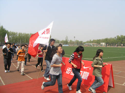 启动仪式之后,各院系负责人手持主会旗和各系分会系旗带领全校学生进行了长跑,五个方阵的同学手腕分别系有五环颜色的丝带,脚上拴有体能测试芯片,以此表示北农学生对奥运的热切期盼,对“微笑北京步步为赢”活动的支持。