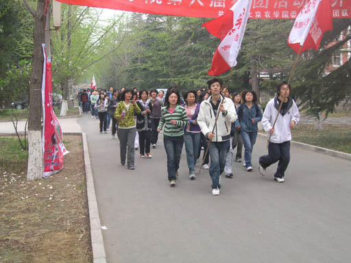 4月10日,由各系组成的五个方阵环绕北农优雅而美丽的校园,依照奥运五环的形状完成全程2008米的长跑。同学们沿着北农特有的路线,充分利用校园宁静、宽广的环境,共同完成2008米的跑步全程。每一位同学都怀着无比激动的心情,带着对2008年北京奥运会的畅想、激情与热爱,挥舞着旗帜,在玉兰的高洁和桃花的烂漫下充分感受着我们共同的北农之春。