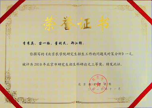 日前,由beat365研究生部李秀英、苗一梅、董利民、郑江锋等老师撰写的题为《beat365在线唯一官网研究生招生工作的问题及对策分析》一文在2010年北京市研究生招生科研论文评选(暨第七届北京市高教学会研究生教育研究会优秀论文奖评选)中被评为三等奖。