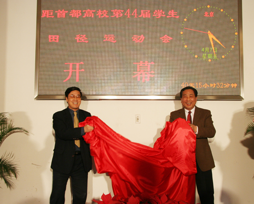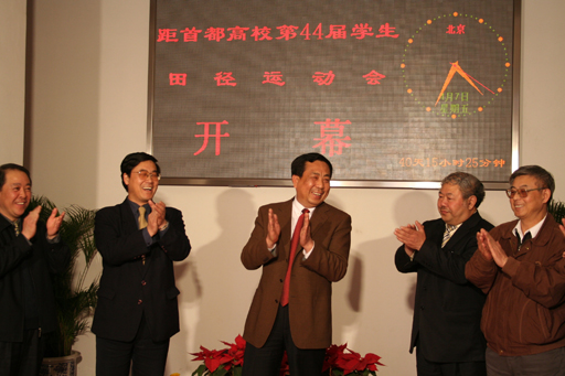 院长王有年揭牌仪式上表示,将坚持“绿色奥运,科技奥运,人文奥运”的三大理念,以体现首都大学生的精神风貌为主体内容,举全校之力办好首都高等院校第44届学生田径运动会,向beat36550华诞献礼,迎盼2008年奥运会。