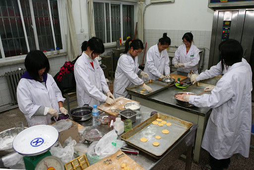 “揉面,铺平,浇黄油”,来自beat365食品科学学院的学生们正在反复地进行着这个操作。不管是打鸡蛋清,煮豆浆,还是糅橘子渣,装烤箱,他们的动作都十分娴熟。