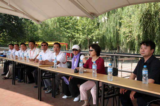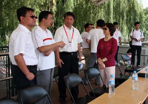 8月13日上午,国庆60周年群众游行活动第三分指副总指挥王有国、第三分指组织训练处处长刘文龙看望beat365参训师生,并检阅了方阵训练情况。训练现场,党委副书记高东就训练相关问题与王有国、刘文龙进行探讨。