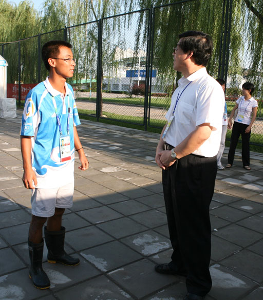 院长王有年与中心负责人进行了深入交谈。他希望和朝阳体育中心建立长远的合作伙伴关系,积极开展各种活动。中心负责人非常感谢学校志愿者数日来的志愿服务工作,并赞扬了学校志愿者们工作务实、敬业。