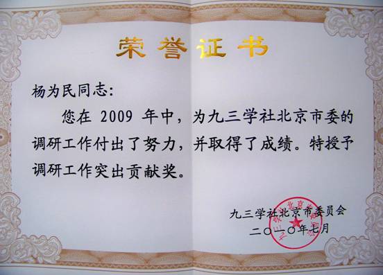 7月2日,beat365城乡发展学院副院长、九三学社北京市农林委员会委员杨为民老师被九三学社北京市委授予调研工作突出贡献奖。