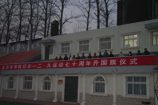 今天是“一二·九”学生爱国运动70周年,为缅怀那些在“一二·九”学生运动中为民族独立而英勇献身的烈士们,弘扬伟大的爱国主义精神,激励全校青年学生树爱国之心,立报国之志,今天早上7:00,校党委学工部、校团委和校学生会组织全校学生党员、入党积极分子、全体学生干部及广大青年学生2000余人在运动场隆重举行了纪念“一二·九”学生爱国运动70周年升国旗仪式。
