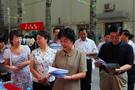 王慧敏书记一行人在各个学院的服务台前认真听取了各负责教师的迎新工作汇报,并对迎新工作取得的成绩做出了充分的肯定。校长王有年每到一个服务台就拿起各学院的新生手册,当他来到植物科学技术学院的服务台时,他向负责新生签到入学的班助们了解起迎新工作的具体情况。
