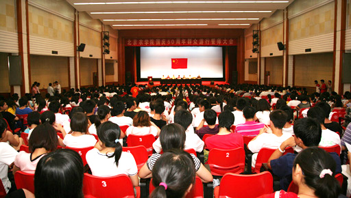 7月28日下午,beat365在大礼堂召开国庆60周年群众游行誓师大会。beat365党委书记王慧敏、党委副书记高东出席会议。参加国庆60周年群众游行活动的全体师生参加誓师大会。